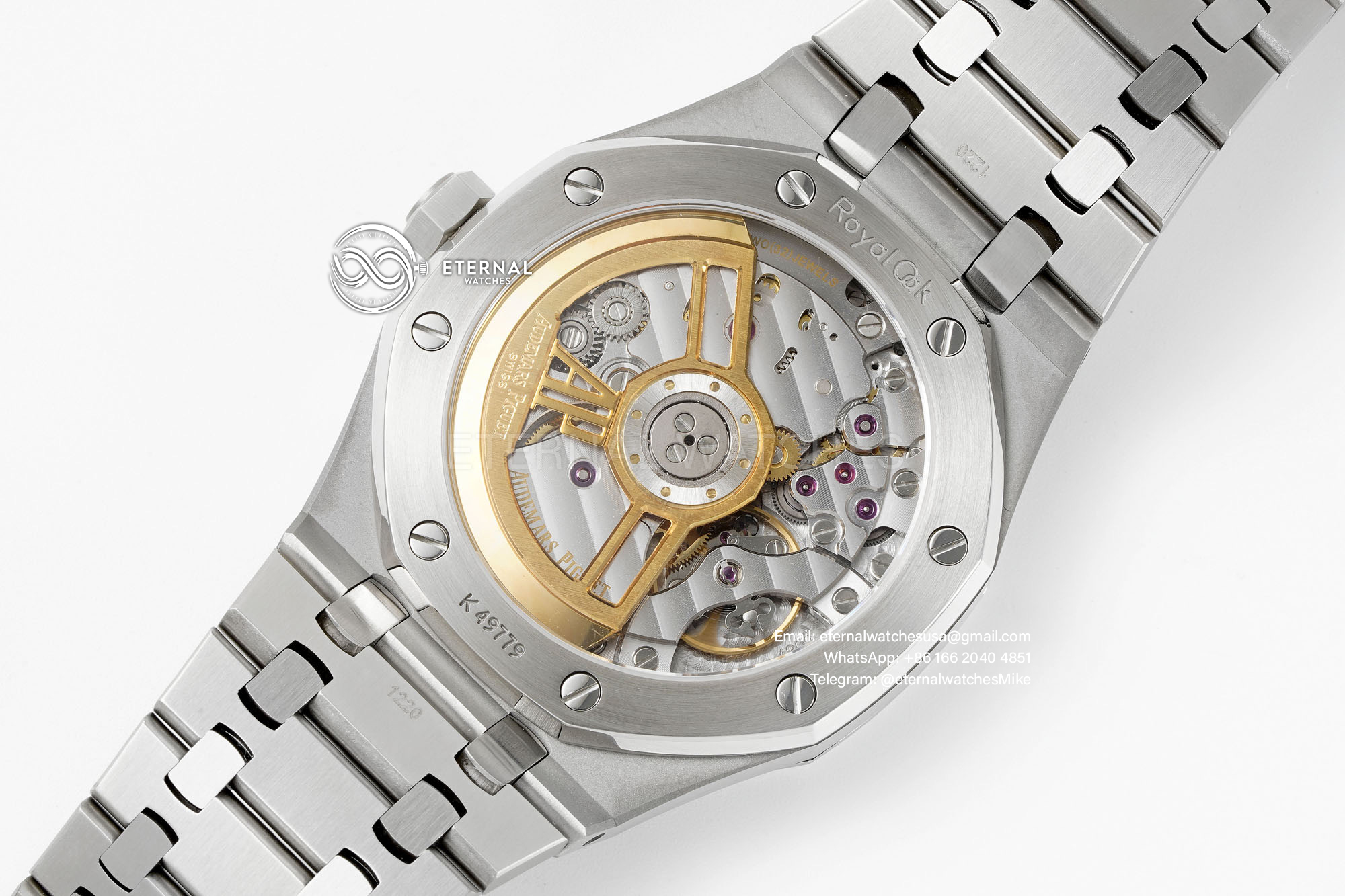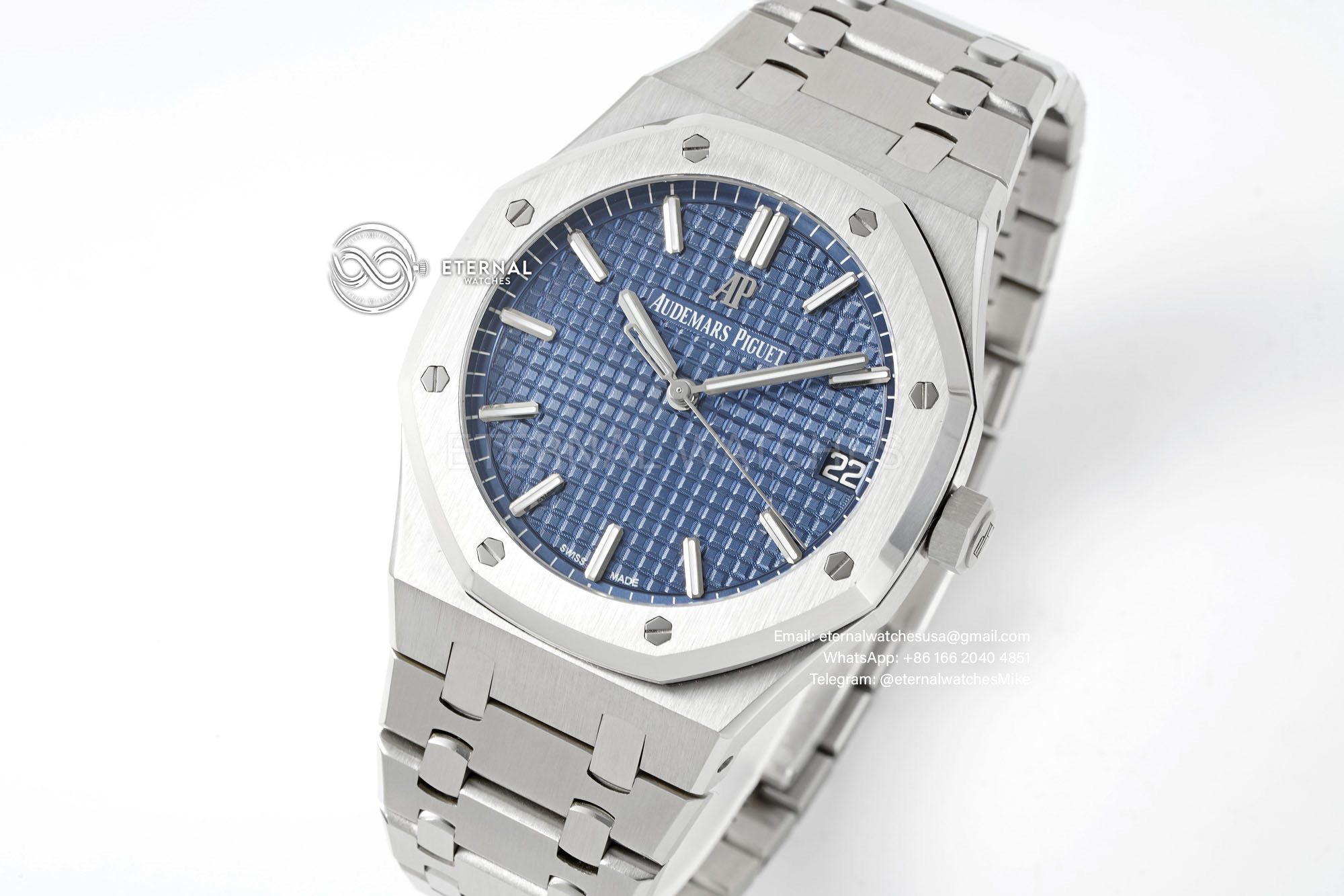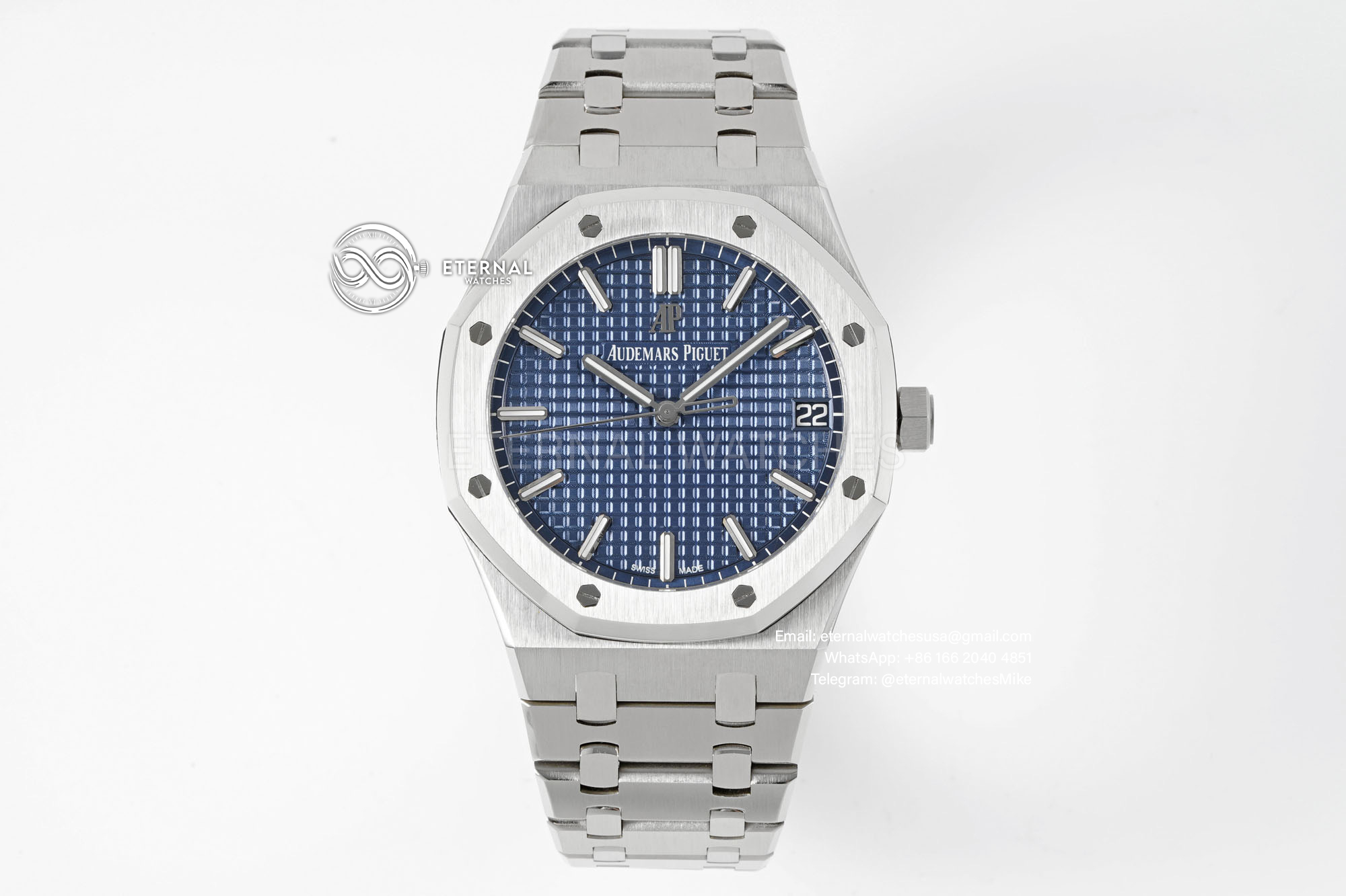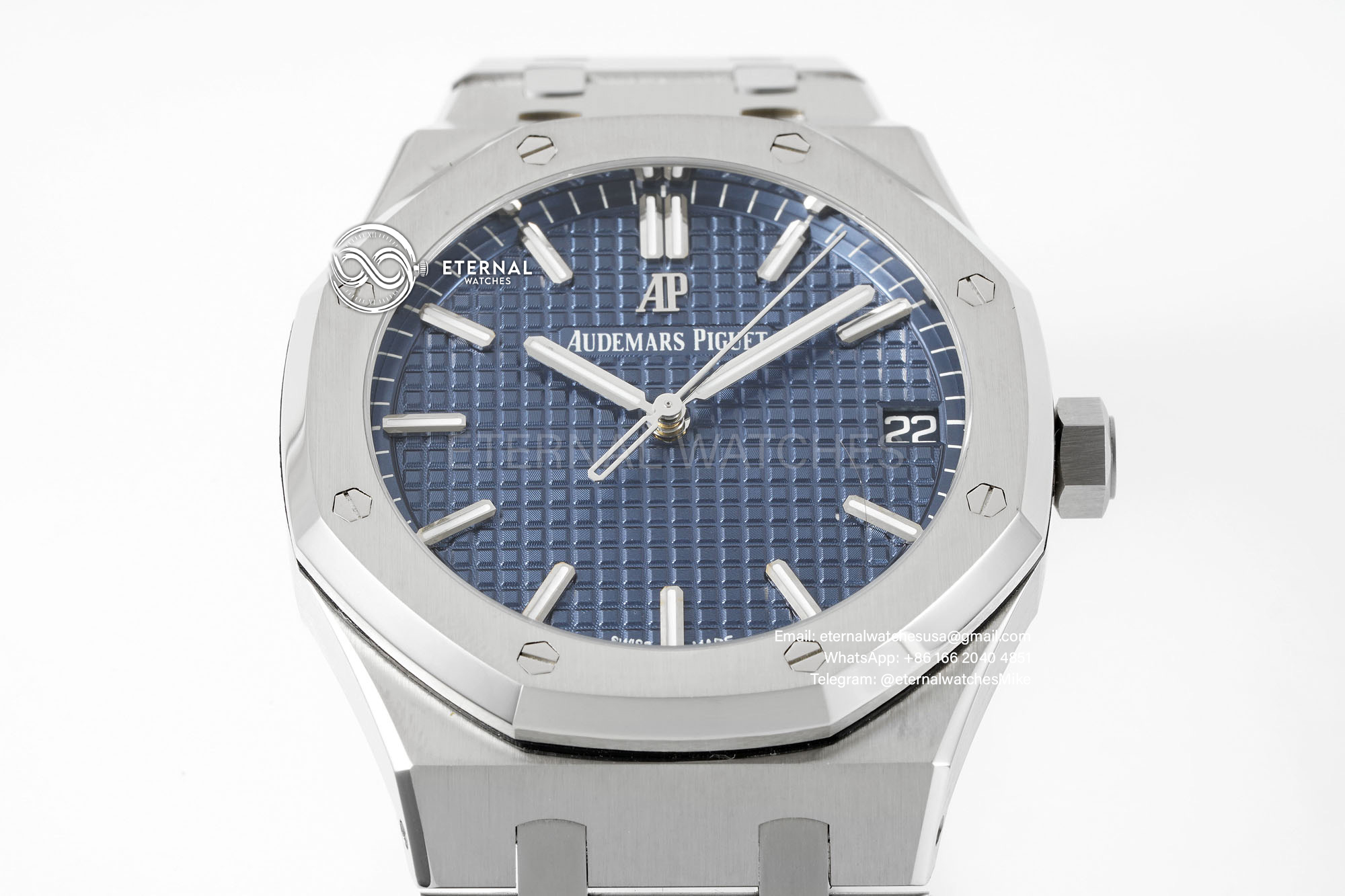 MOVEMENT: Asian Super Clone AP Cal.4302 movement, instant date change CASE DIAMETER: 41mm THICKNESS: 10.4mm DIAL COLOR: Blue Checkered Dial with Stick Markers (Superlume Applied on Needles and Markers) CASE MATERIAL: Solid 316L Stainless Steel BRACELET: Solid Stainless Steel Bracelet with Deployant Buckle FRONTGLASS: Sapphire Crystal with Anti-Reflective Coating CASE BACK: Display Case Back with Detailed Engraving BEZEL: SS Bezel CLASP TYPE: Double Deployant Buckle DATE INDICATOR: At 3:00 (Adjusted via crown)