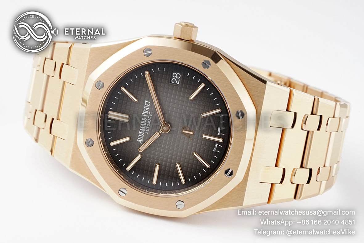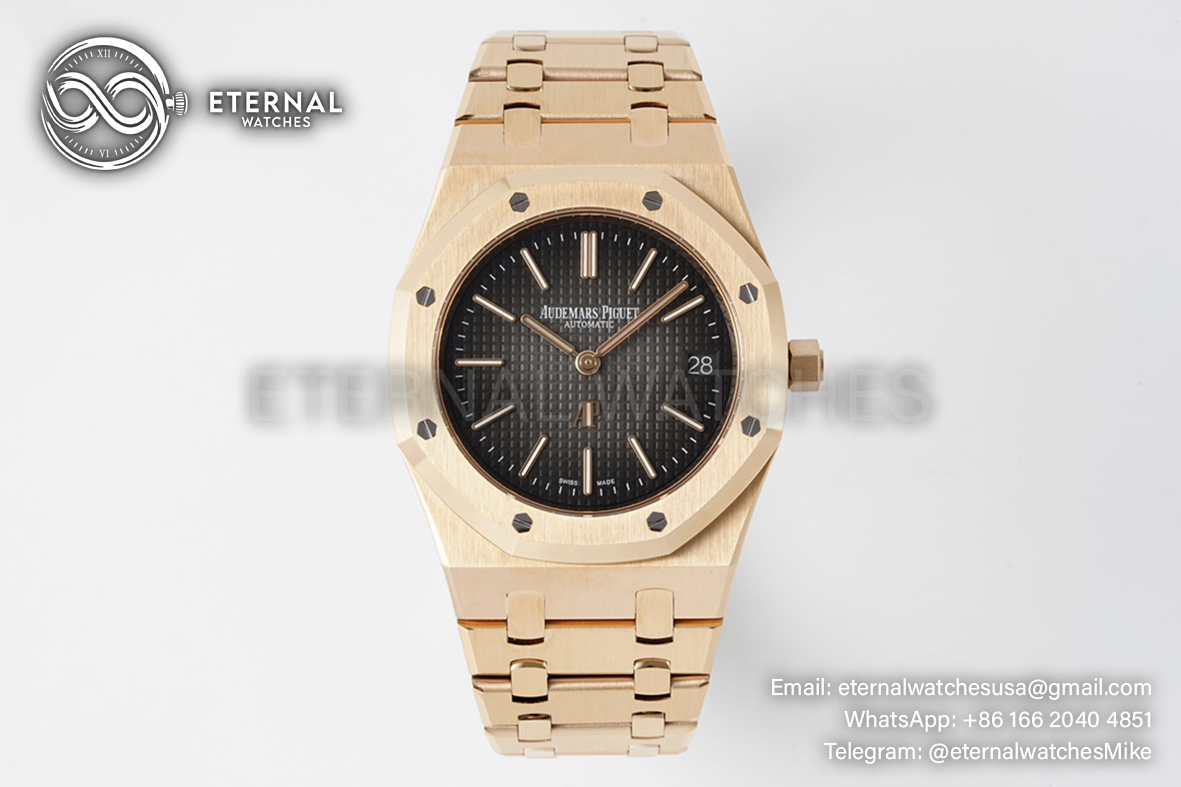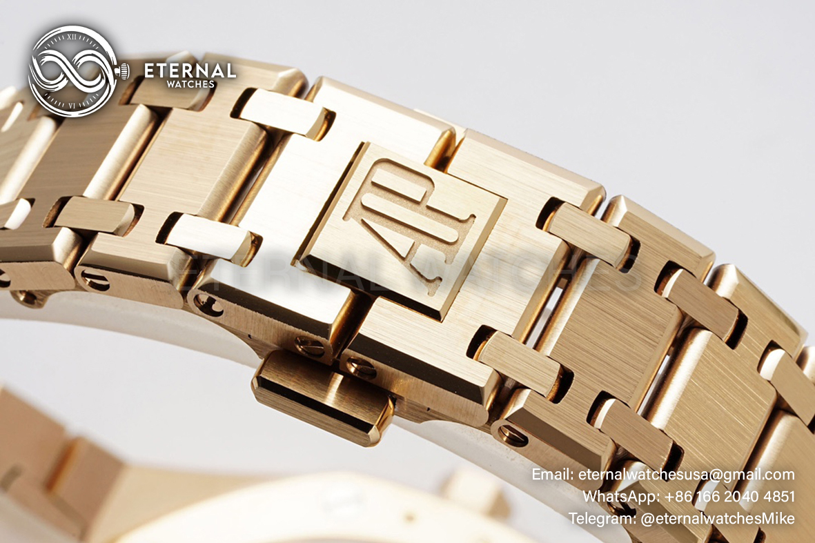 MOVEMENT: Japanese Miyota 9015 decorated to AP 7121 Movement at 28800vph CASE DIAMETER: 39mm THICKNESS: 8.3mm DIAL COLOR: Grey Checkered Dial with Stick Markers CASE MATERIAL: 18K Rose Gold Plated Solid Stainless Steel 316L BRACELET: 18K Rose Gold Plated Solid 316L Stainless Steel Bracelet with Deployant Buckle FRONT GLASS: Sapphire Crystal with Colorless Anti-Reflective Coating CASE BACK: Display case back with detailed engraving BEZEL: Polished/Brushed bezel (same construction as genuine) with recessed bezel screws as per genuine CLASP TYPE: Deployant Clasp DATEINDICATOR: At 3:00 (Adjusted via crown)