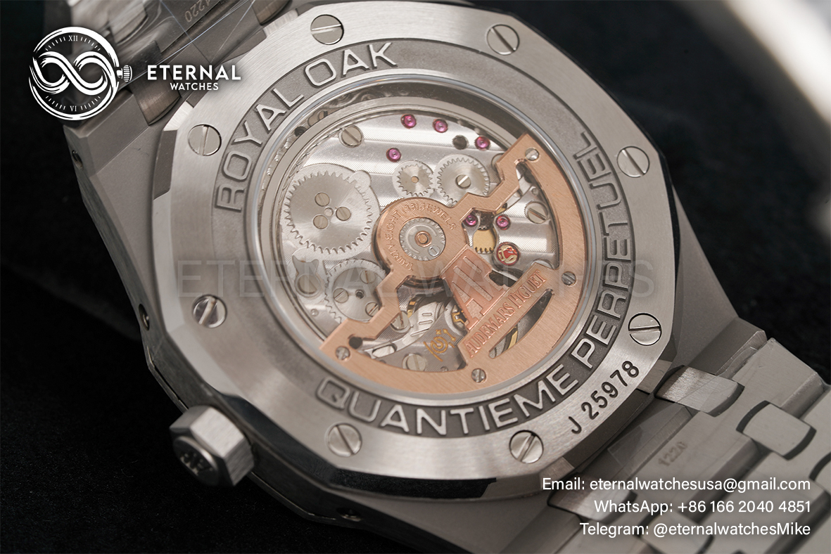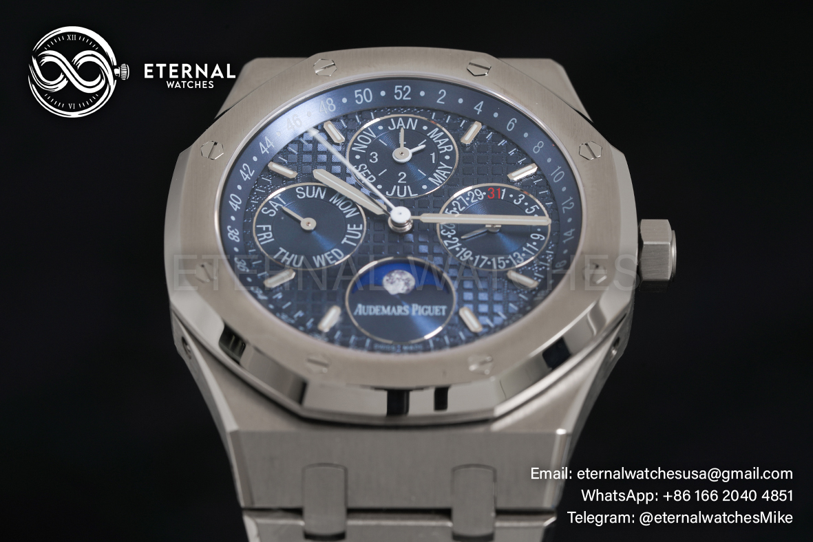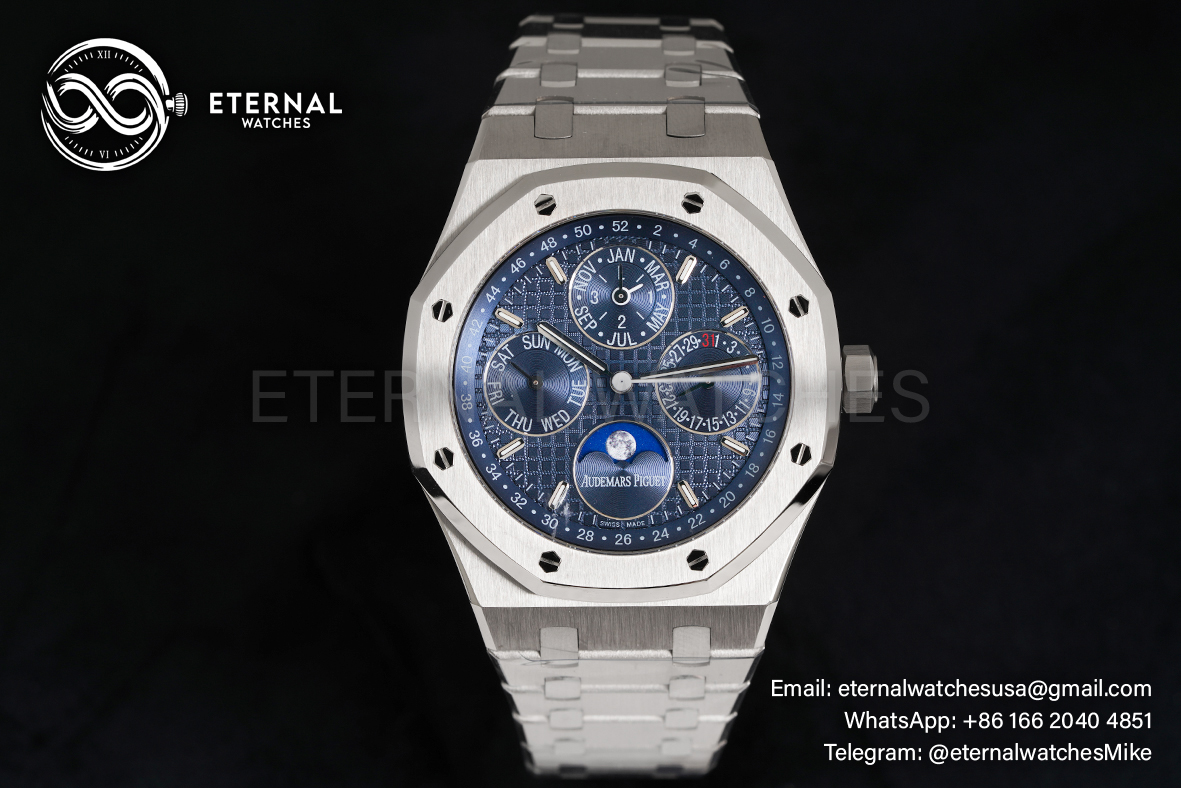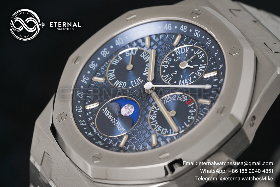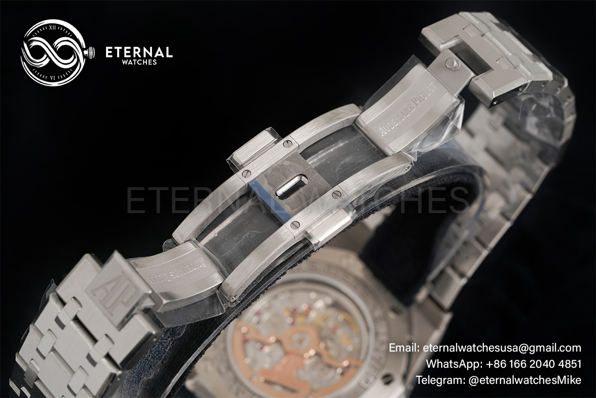 MOVEMENT: Asia 23J Automatic Movement with decorated rotor like Genuine AP Calibre 5134 CASE DIAMETER: 41mm THICKNESS: 10.5mm DIAL COLOR: Blue Checkered Dial with Stick Markers and Subdials CASE MATERIAL: Solid 316L Stainless Steel BRACELET: Solid 316L Stainless Steel Bracelet with Deployant Double Fold Buckle FRONT GLASS: Sapphire Crystal CASE BACK: Display case back with detailed engraving BEZEL: Stainless Steel Bezel CLASP TYPE: Deployant Clasp DATE INDICATOR: At Subdial at 3:00 (Adjustable via the crown)