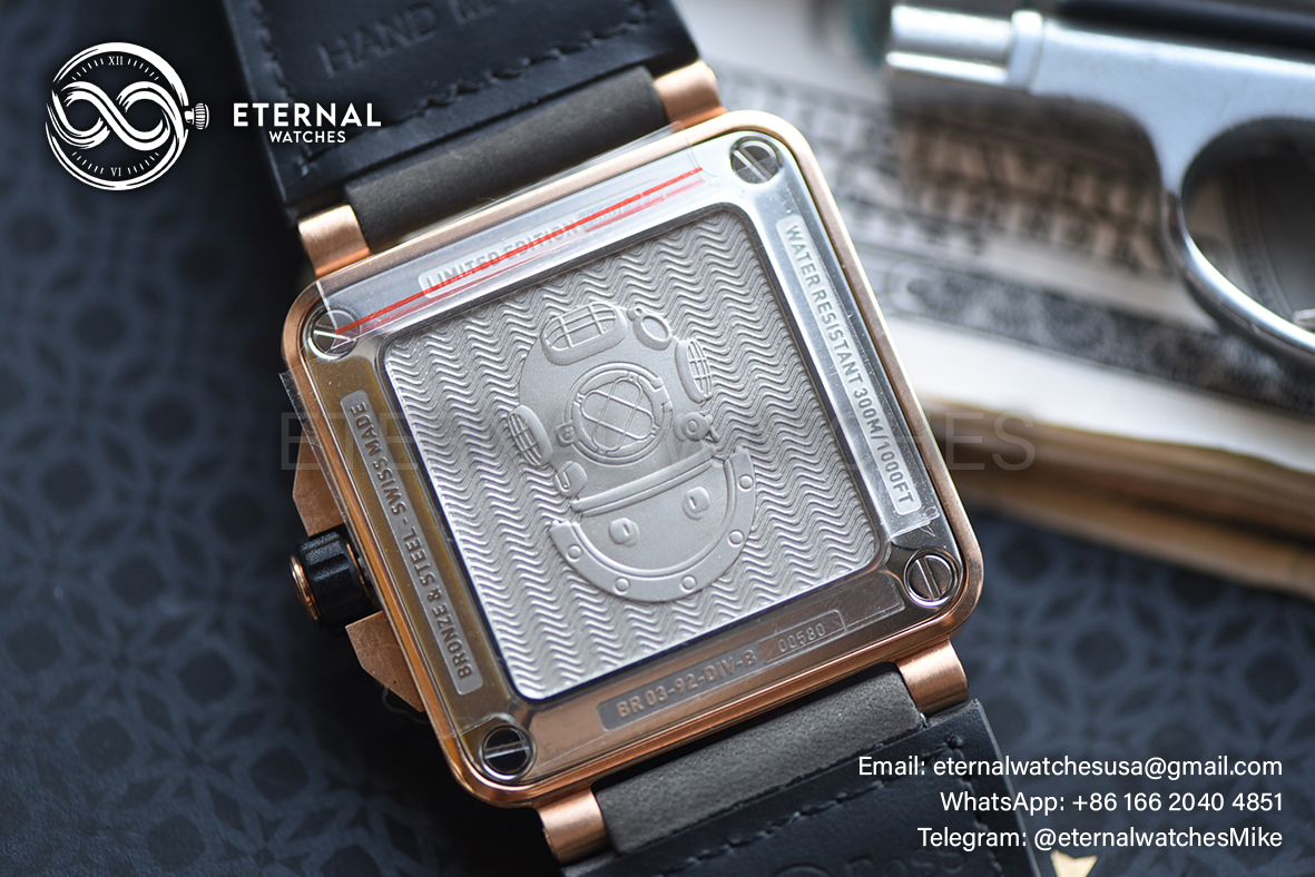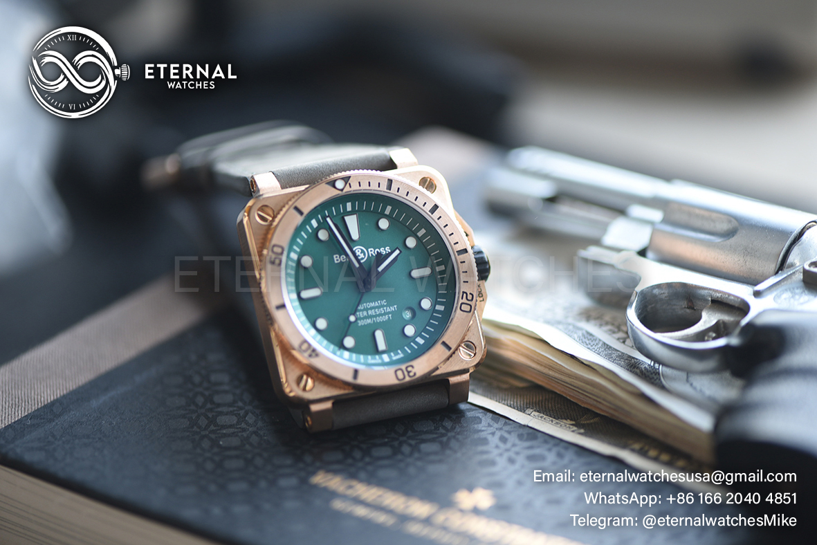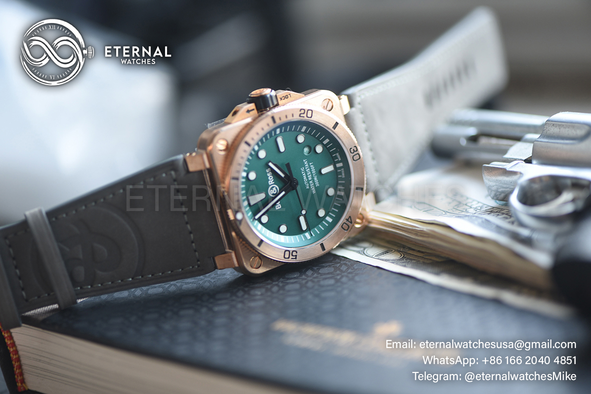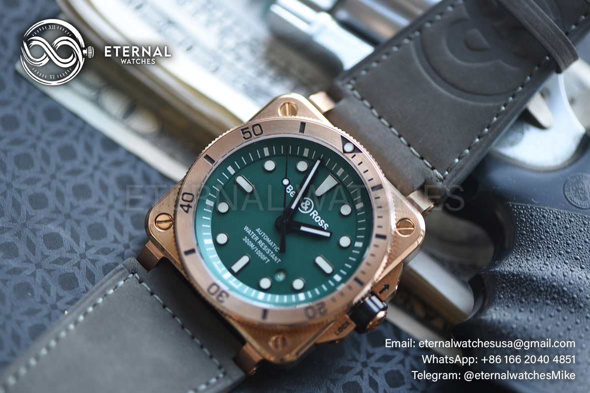 MOVEMENT: Nickle Plated Japanese Miyota 9015 Automatic Movement CASE DIAMETER: 42mm X 42mm THICKNESS: 11mm (1 : 1 Casework Profile) DIAL COLOR: Green Dial with Stick Markers (Swiss Grade Superlume Applied) CASE MATERIAL: Solid Bronze (Case back Screws are Real with Removable Lugs) BRACELET: Grey Leather + Black Rubber Strap with Insignia Buckle and Tool Kit FRONT GLASS: Sapphire with Light AR Coating (Swiss Grade) - Bronze Bezel BACK GLASS: Solid Case Back with detailed Engraving CLASP TYPE: Normal Tang Buckle DATE INDICATOR: At 4:30 (adjusted via crown) OTHER REMARKS: Waterproof to 30m direct from Factory