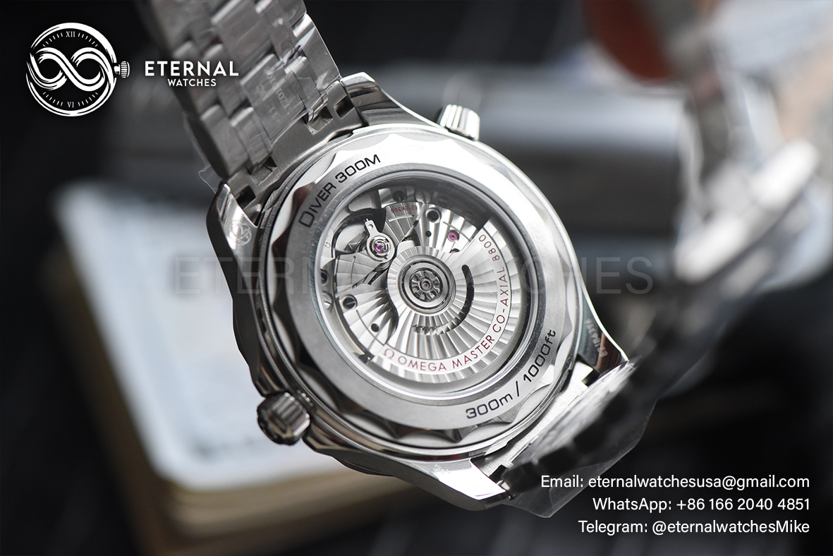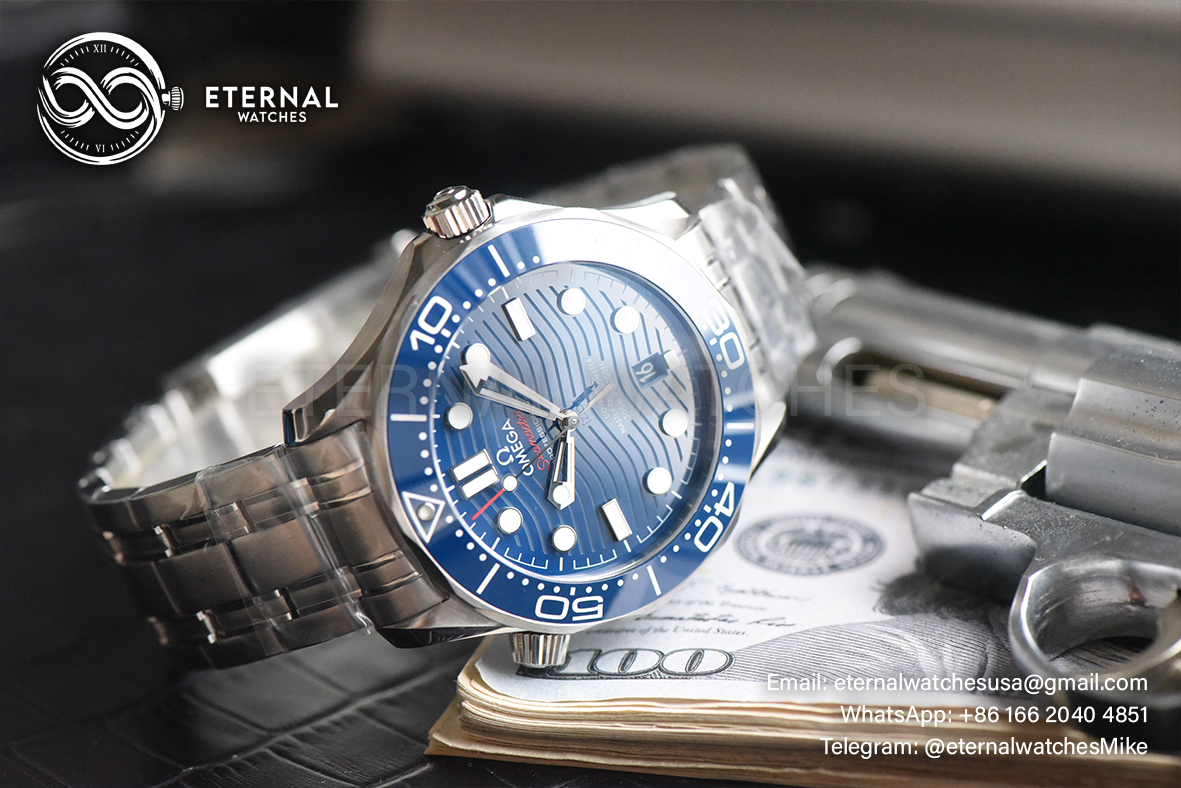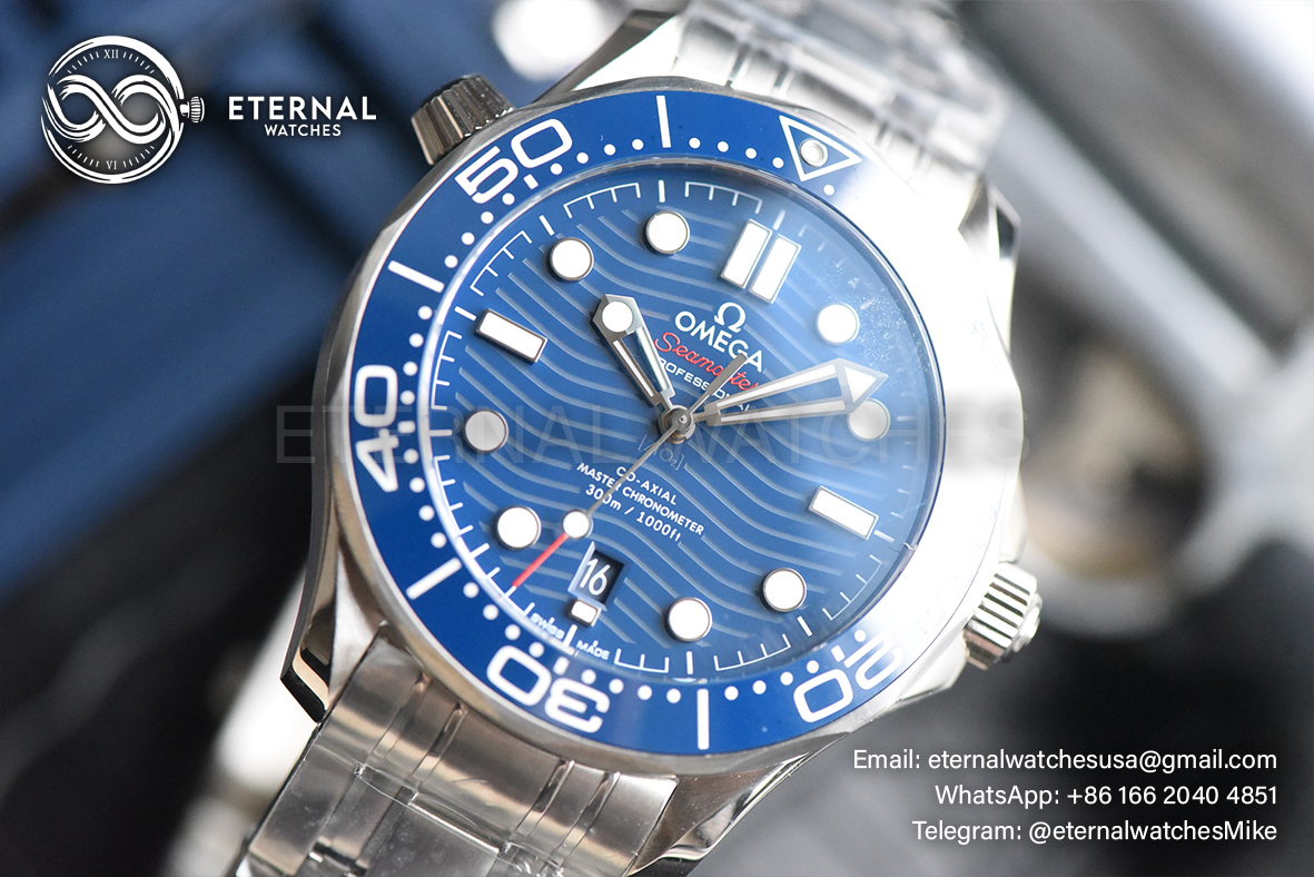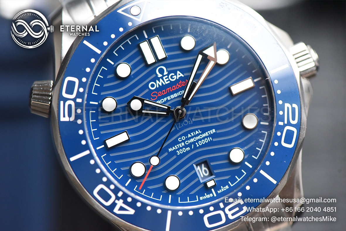 MOVEMENT: Asia Clone A8800 Omega Automatic Movement with Decorated Rotor & Bridges/Plates like Genuine Omega Calibre 8800 CASE DIAMETER: 42mm THICKNESS: 13mm DIAL COLOR: Blue Ceramic Base Plate Dial (Wavy Textured) with Large Dot Markers (Blue Superlume Applied for the Dial markers & Green Superlume applied for the Needles) CASEMATERIAL: Solid Stainless Steel 316L BRACELET: Solid Stainless Steel 316L Bracelet with Deployant Buckle (Updated Clasp) FRONT GLASS: Sapphire Crystal with AR Coat (Swiss Standards) CASE BACK: Display case back with detailed engraving (Serial engraved behind lugs at 7:00) BEZEL: Blue Ceramic Bezel (Uni-Directional) HACK MOVEMENT: Yes CLASP TYPE: Deployant Buckle DATE INDICATOR: At 6:00 Position (Adjusted via crown)