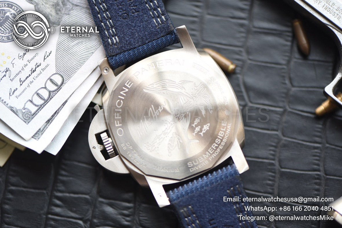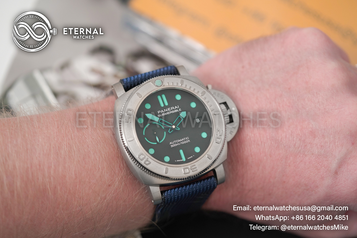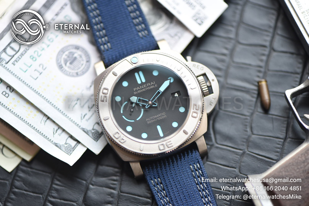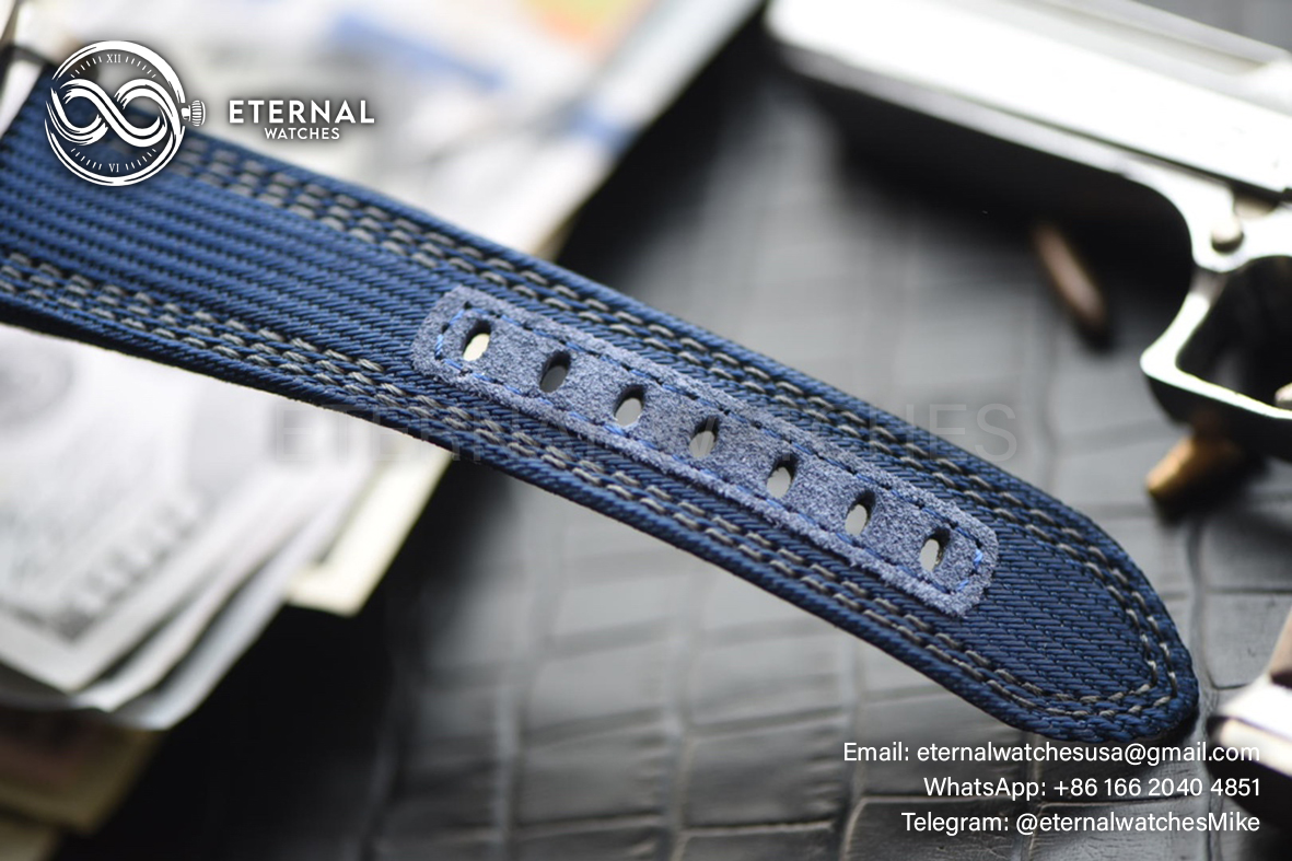 MOVEMENT: Super Clone P9010 Automatic movement, 28800bph, Cut out design Rotor as per genuine, Modified to P9010 Caliber Look **Correct Position of the balance wheel at 7:00 **Reliable custom super clone P9010 movement tested for more than 1 year CASE DIAMETER: 47mm THICKNESS: 15mm DIAL COLOR: Black Dial with Black Subdials with Blue Colored Round Markers (With Swiss Grade SuperLume Applied) CASE MATERIAL: Swiss grade Solid Titanium Case BRACELET: Blue Nylon Clad Calf Leather Strap with Tang Buckle FRONT GLASS: Sapphire Crystal with Colorless AR Coating (Swiss Grade) CASE BACK: Solid case back with Detailed engraving, Individual V Serial VXX/19 and matching BB Numbers. BEZEL: Uni-Directional Titanium Bezel with Numerals and Pearl Pip CLASPTYPE: Tang Buckle DATE INDICATOR: At 3:00 (Adjusted via the Crown) OTHER REMARKS: Waterproofed to 30m direct from Factory