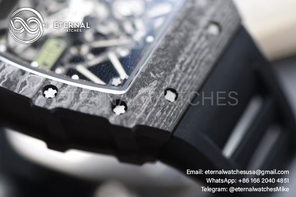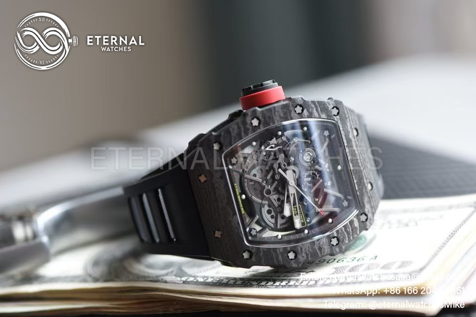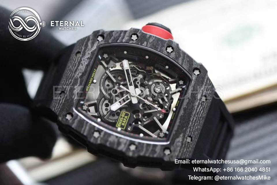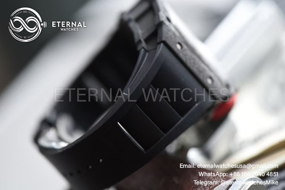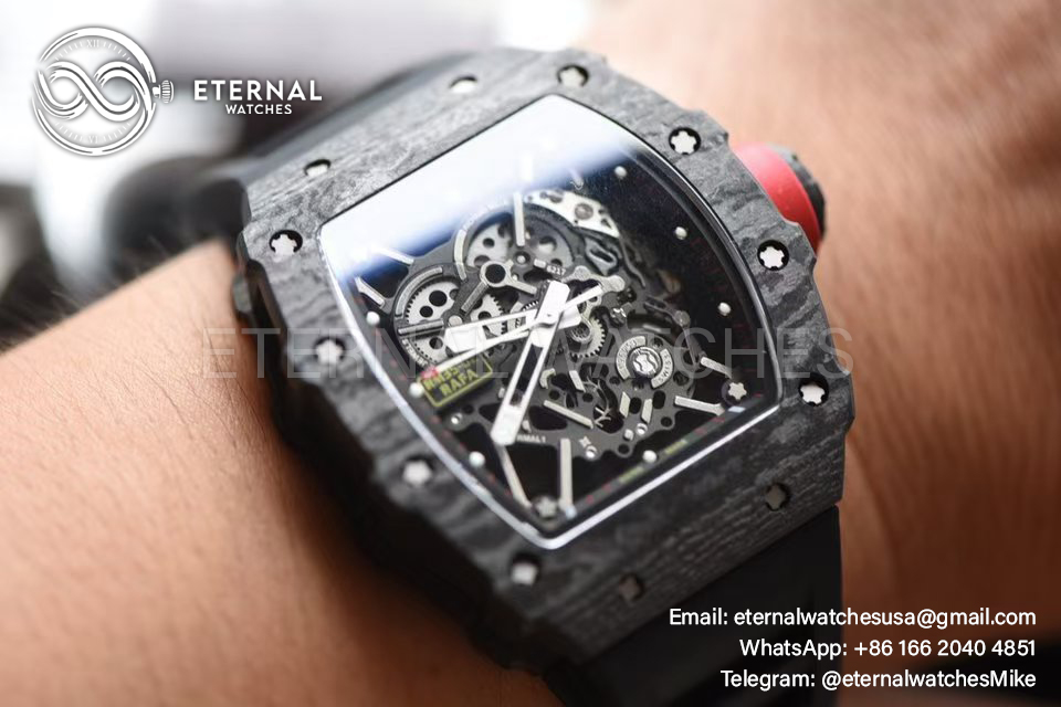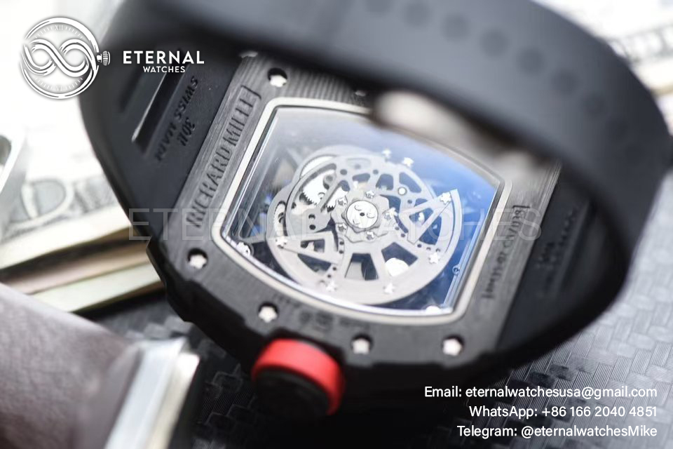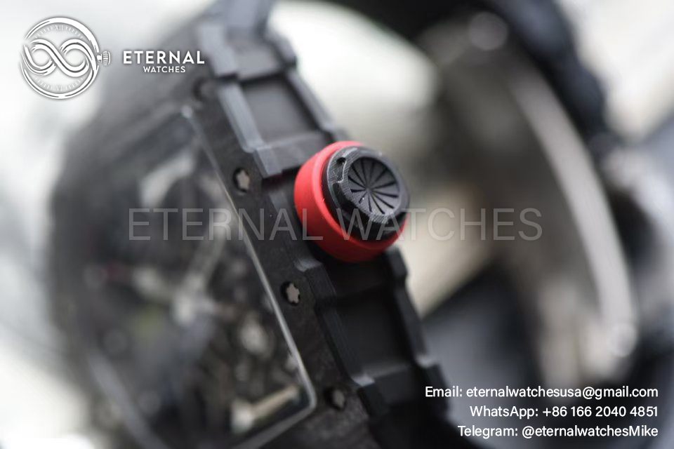 MOVEMENT: Japanese Seiko NH05 Automatic Movement, Decorated to Gen Richard RMAL1 Movement CASE DIAMETER: 42.5mm x 49.9mm THICKNESS: 14.5mm DIAL COLOR: Custom Skeleton Dial with Black Inner Bezel Rahaut CASE MATERIAL: Black Foreged Carbon Case with Red Crown BRACELET: Black Vented Strap with Deployant Buckle FRONT GLASS: Sapphire Crystal with AR Coating CASE BACK: Solid Case Back BEZEL: Black Carbon Bezel CLASP TYPE: Deployant clasp