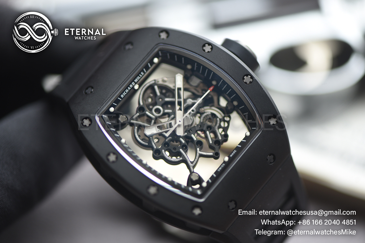 MOVEMENT:Customized Super Clone RMUL2 Automatic Movement, Upgraded Skeleton Dial Layout CASE DIAMETER:43mm THICKNESS:13.5mm DIAL COLOR:Skeleton Dial with Black Inner Bezel Rehaut CASE MATERIAL:Black Ceramic Case with Black Crown BRACELET:Black Vented Strap with Hight Quality Deployant Buckle FRONT GLASS:Super Clear Sapphire Crystal with Correct AR Coating CASE BACK:Display Case Back with Correct AR Coating BEZEL:Black Ceramic Bezel CLASP TYPE:Hight Quality Deployant Clasp