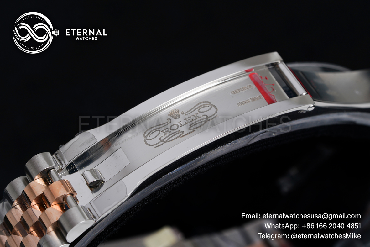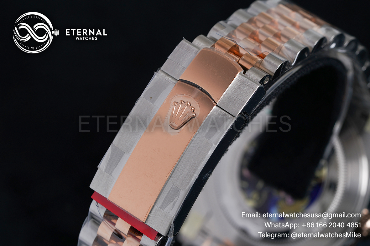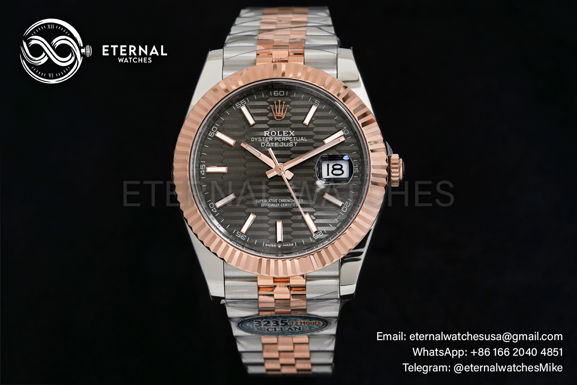MOVEMENT: Asia Clone New Custom SH3235 Automatic Movement, 28800bph with Fully Decorated Rotor and Bridges & Plates like Genuine Rolex Caliber 3235 (Best Made Clone Movement from Clean) CASE DIAMETER: 41mm THICKNESS: 12mm DIAL COLOR: Grey Textured Dial with Stick Markers (Blue Superlume Applied on Hands and Markers) CASE MATERIAL: Solid 904LStainless Steel BRACELET: Two Tone 18K Rose Gold Plated Solid 904L Stainless Steel Jubilee Bracelet with New Style Rolesor Deployant Buckle FRONT GLASS: Sapphire Crystal, Same Thickness and Height above bezel as per Genuine (With etched crown at 6:00 position) CASE BACK: Solid case back BEZEL: Fluted Bezel CLASP TYPE: New Style Rolesor Deployant Buckle DATE INDICATOR: At 3:00 Position (Adjusted via the crown)