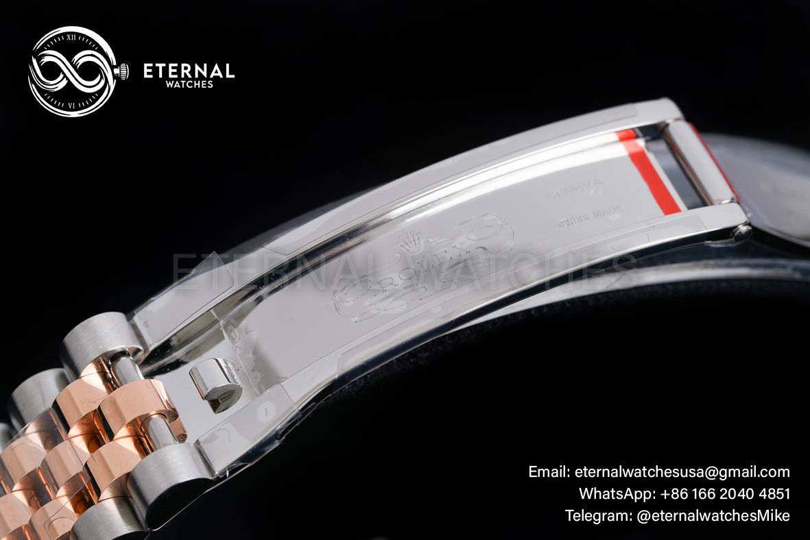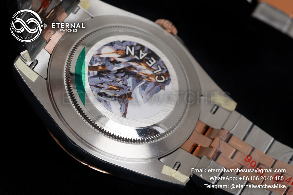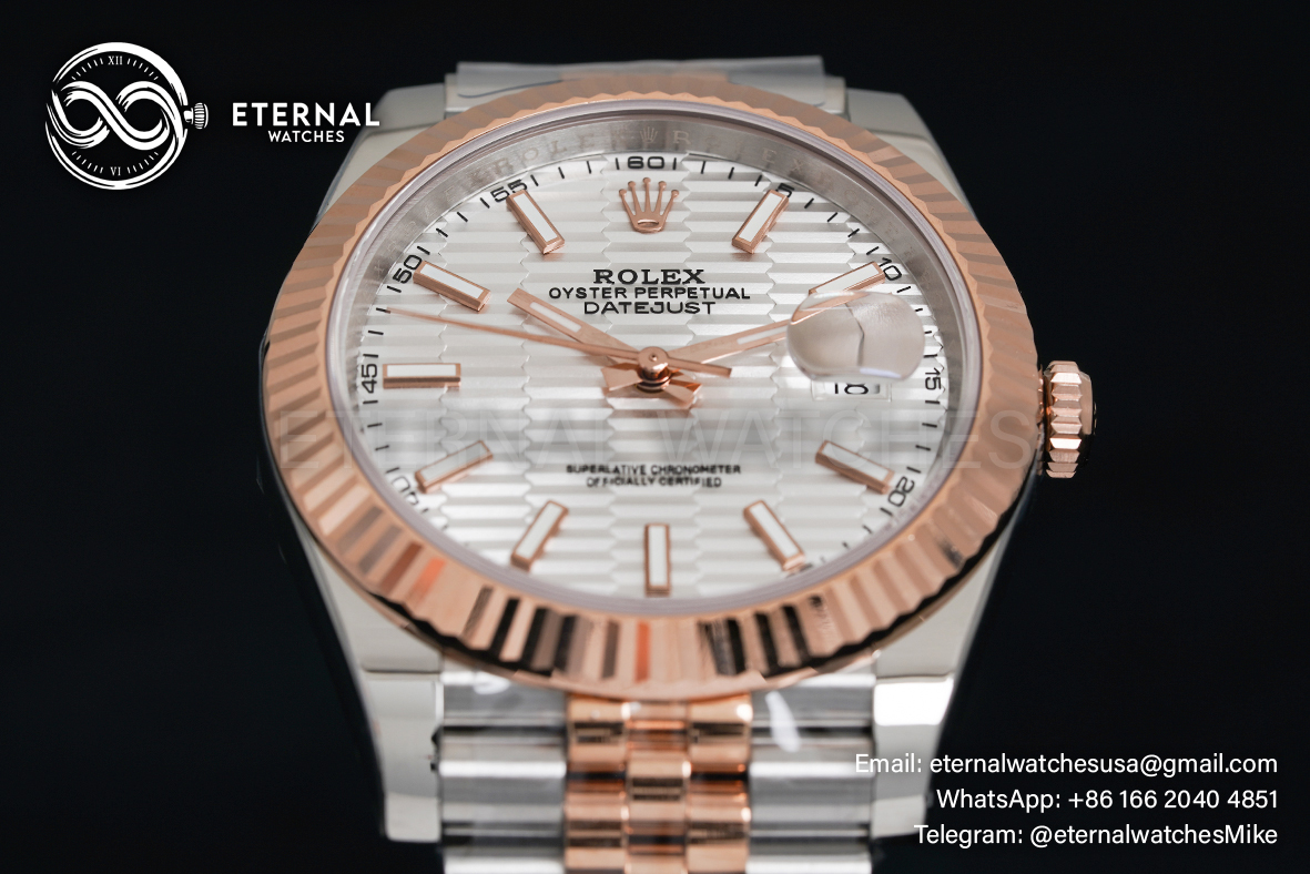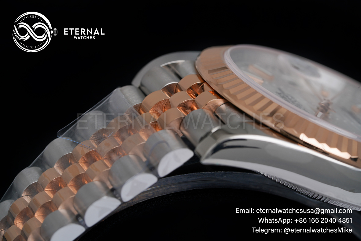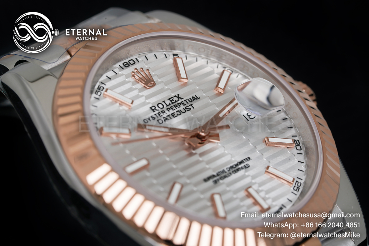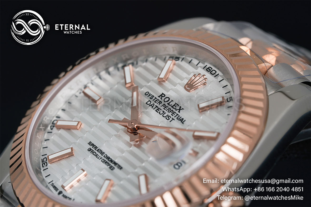 MOVEMENT: Asian Super Clone SH3235 Automatic Movement, 28800bph with Fully Decorated Rotor and Bridges & Plates like Genuine Rolex Calibee 3235, the best 3235 movement at the moment CASEDIAMETER: 41mm THICKNESS: 12mm DIAL COLOR: Silver Textured Dial with Stick Markers (Blue Superlume Applied on Hands and Markers) CASEMATERIAL: Solid Stainless Steel 904L BRACELET: Two Tone 18K Rose Gold Jubilee Bracelet with New Style Rolesor Deployant Buckle FRONT GLASS: Sapphire Crystal, Same Thickness and Height above bezel as per Genuine (With etched crown at 6:00 position) CASE BACK: Solid Case Back BEZEL: Fluted Bezel CLASP TYPE: New Style Rolesor Deployant Buckle DATE INDICATOR: At 3:00 Position (Adjusted via the crown)