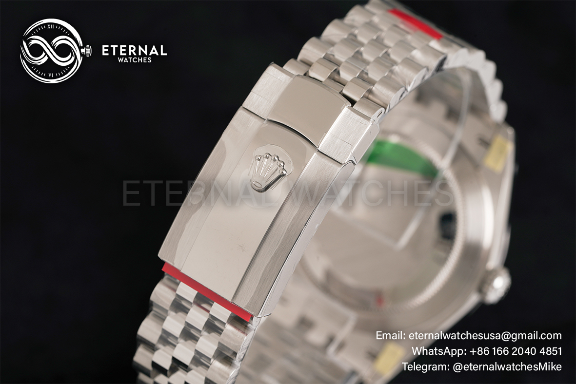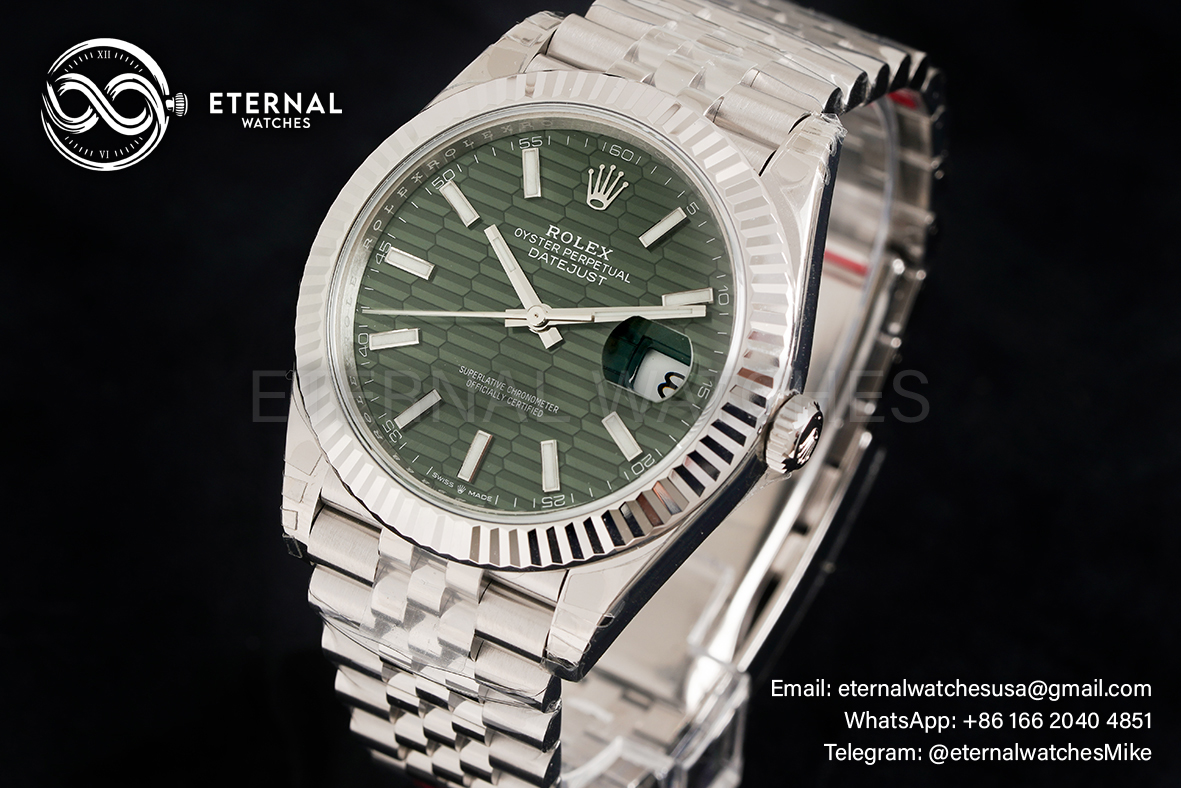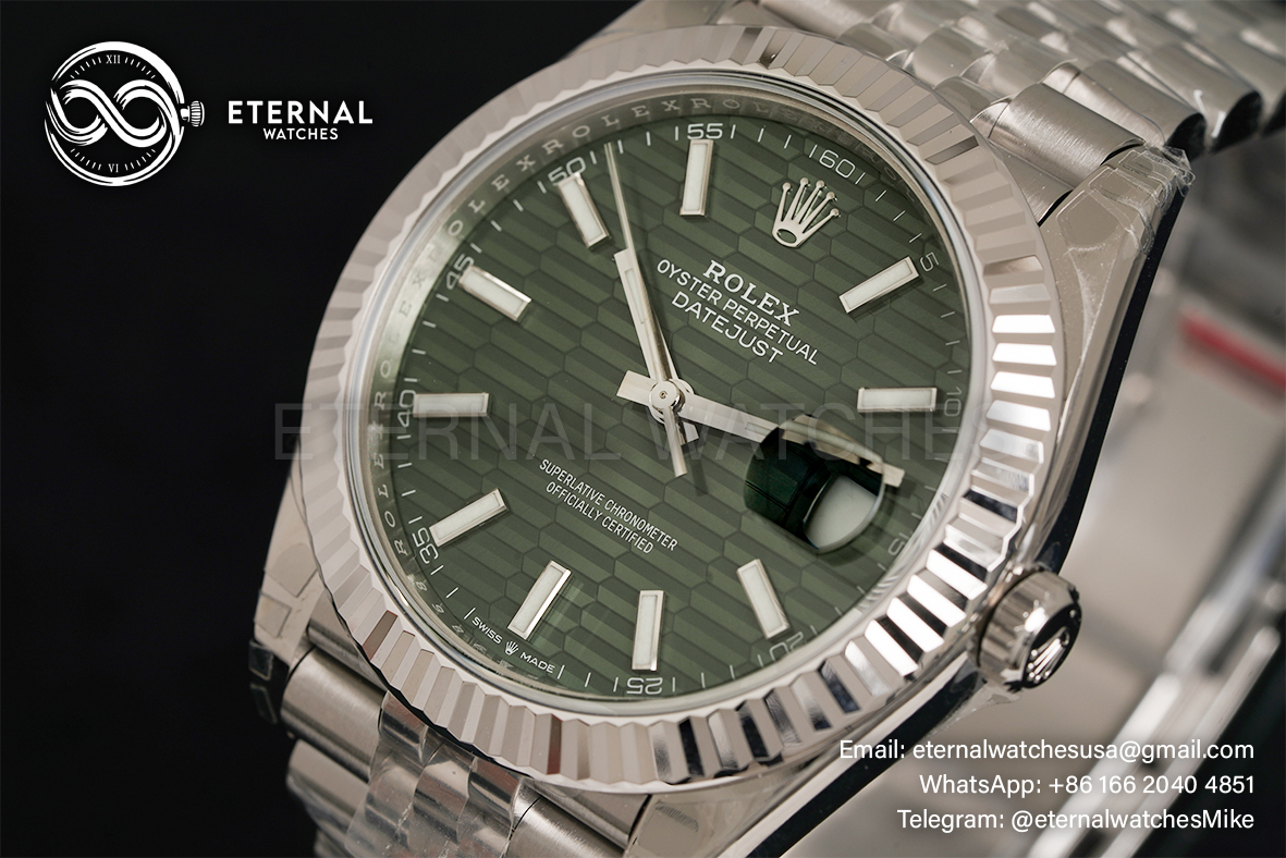 MOVEMENT: Asia Clone New Custom SH3235 Automatic Movement, 28800bph with Fully Decorated Rotor and Bridges & Plates like Genuine Rolex Caliber 3235 (Best Made Clone Movement from VSF) CASE DIAMETER: 41mm THICKNESS: 12mm DIAL COLOR: Green Textured Dial with Stick Markers (Blue Superlume Applied on Hands and Markers) CASE MATERIAL: Solid 904LStainless Steel BRACELET: Solid 904L Stainless Steel Jubilee Bracelet with New Style Rolesor Deployant Buckle FRONT GLASS: Sapphire Crystal, Same Thickness and Height above bezel as per Genuine (With etched crown at 6:00 position) CASE BACK: Solid case back BEZEL: Fluted Bezel CLASP TYPE: New Style Rolesor Deployant Buckle DATE INDICATOR: At 3:00 Position (Adjusted via the crown)
