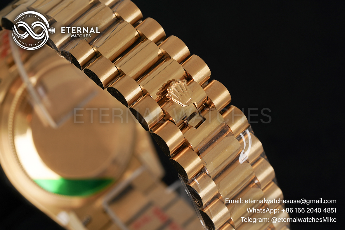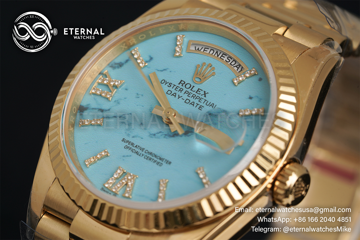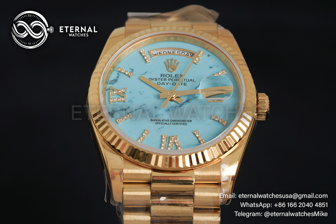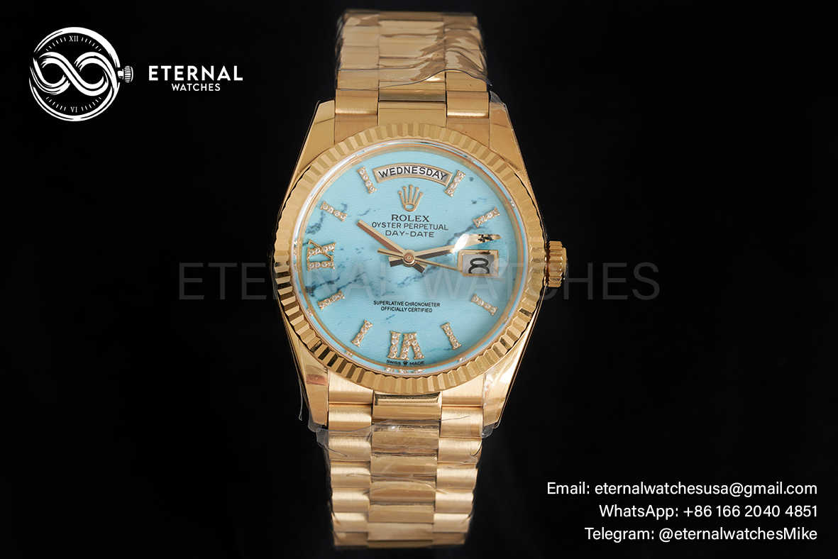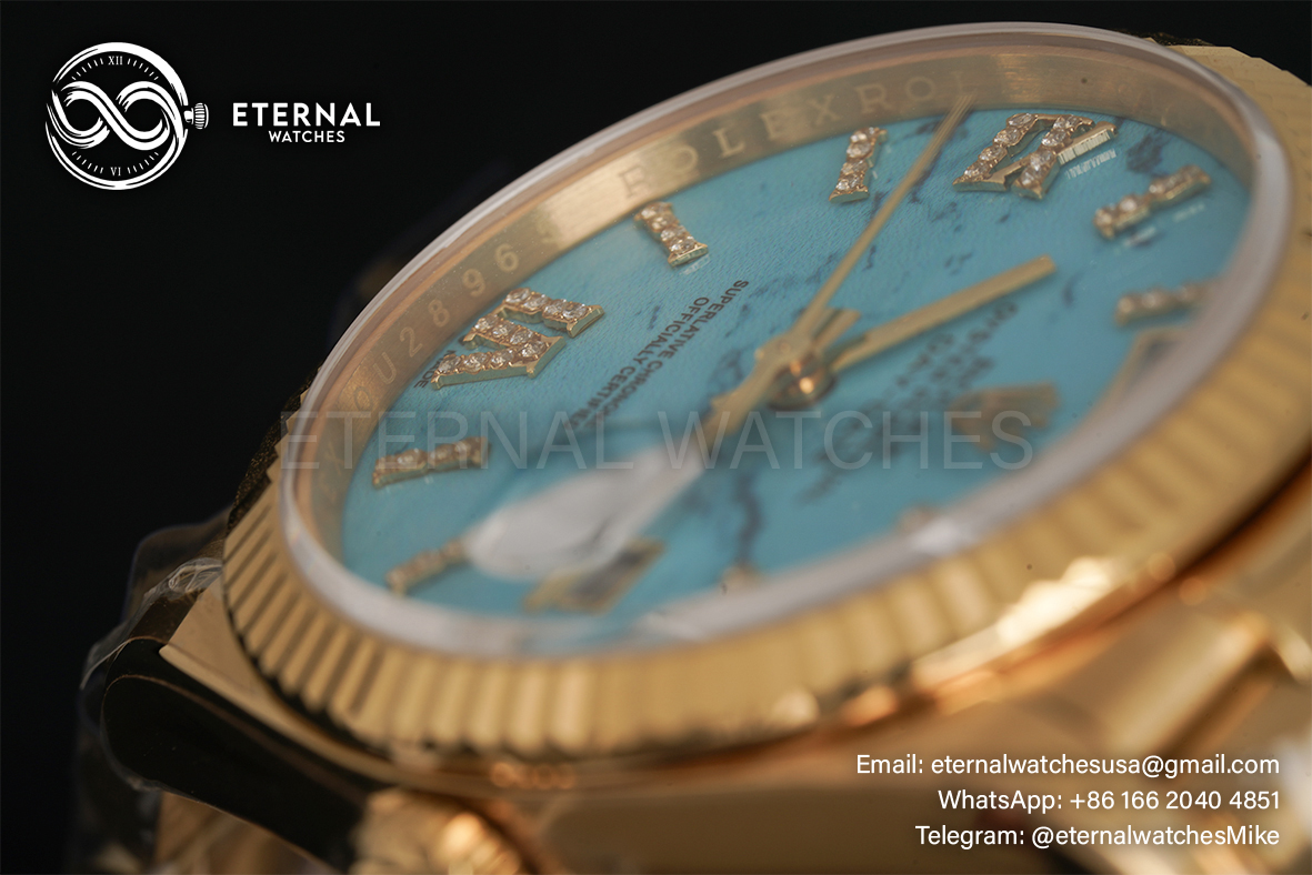 MOVEMENT:Imported Swiss Quartz 2836 Automatic Movement with frequency of 28800vph CASE DIAMETER:36mm THICKNESS:12.2mm DIAL COLOR:Turquoise Dial with Diamond Markers CASE MATERIAL:18K Yellow Gold Wrapped Solid 904L Stainless Steel BRACELET:18K Yellow Gold Wrapped Solid 904L Stainless Steel Bracelet with Deployant Clasp FRONT GLASS:Scratch-proof Sapphire Crystal CASE BACK:Solid Case Back BEZEL:Fluted Bezel CLASP TYPE:Hidden Rolesor Clasp