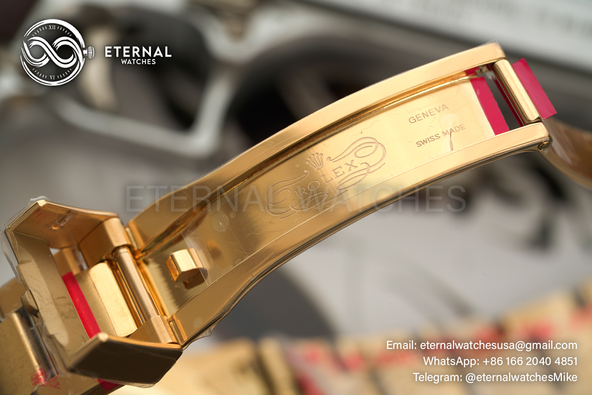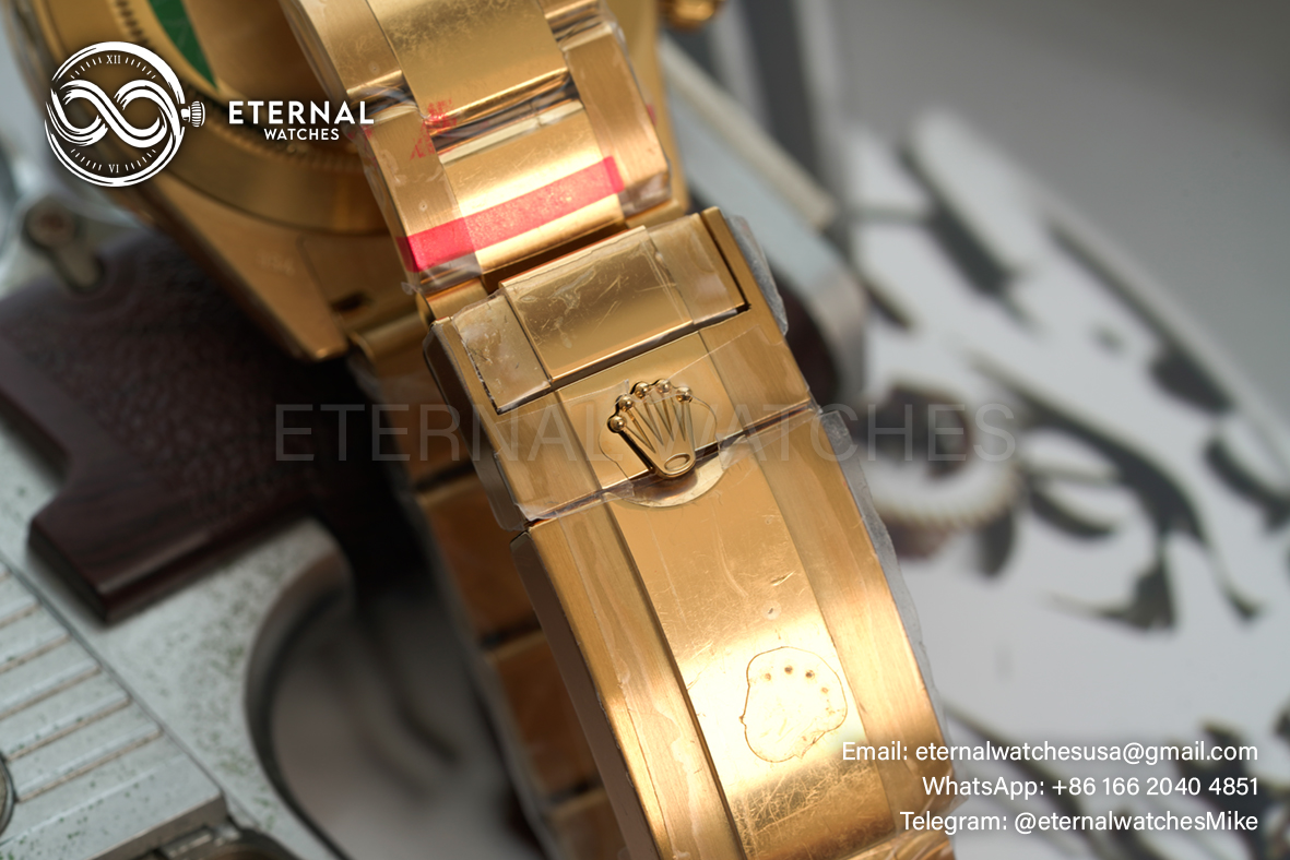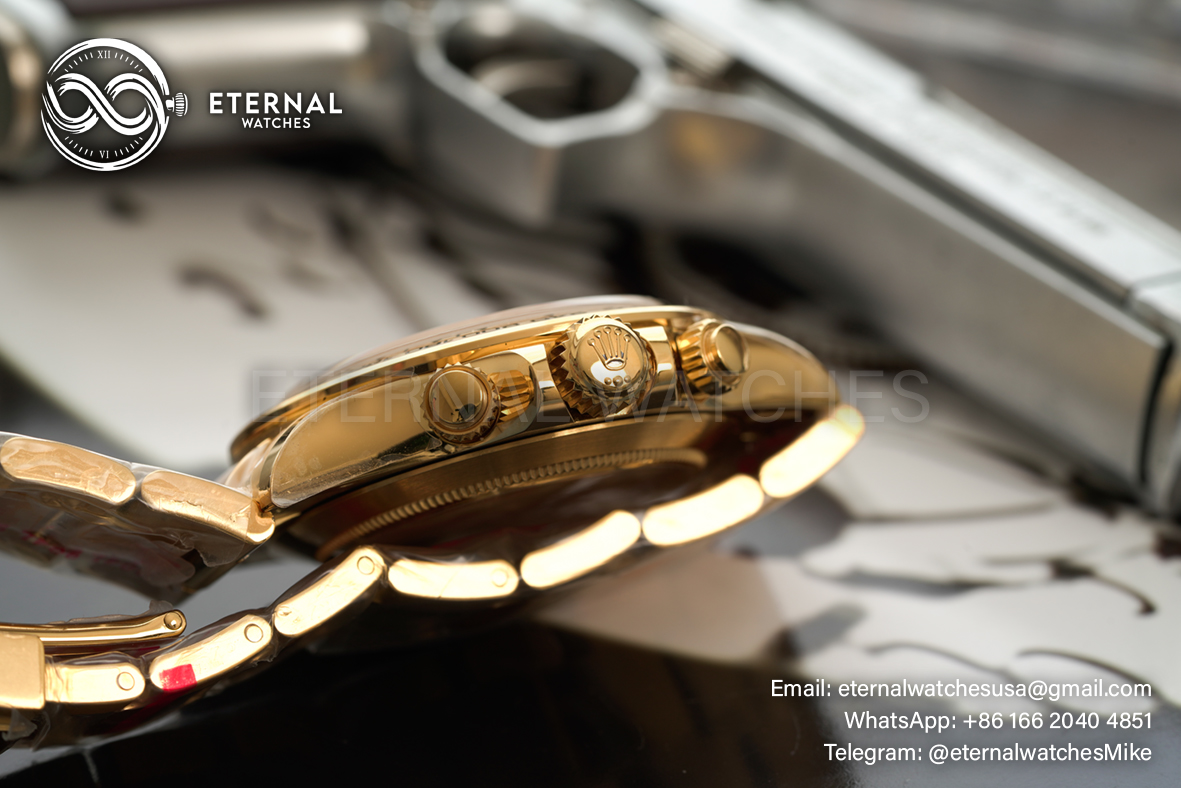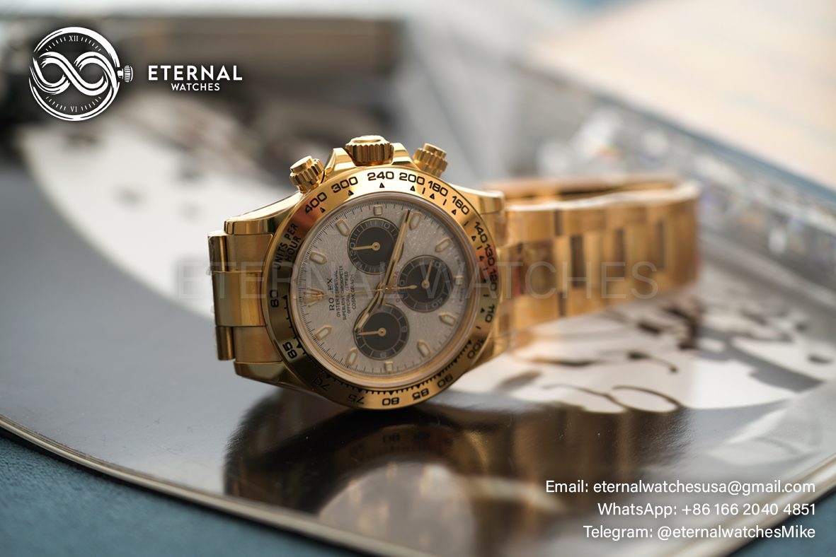 MOVEMENT: Super Asia Clone 4130 Slim Chronograph Automatic with Fully Functional Chronograph and fully decorated Rotor & Bridges/Plates like Rolex Genuine Calibre 4130 for Daytona Chronograph (Blue spring same as genuine) CASE DIAMETER: 40mm THICKNESS: 12.2mm DIAL COLOR: Meteorite/Black Dial & Stick Markers CASE MATERIAL:18K Yellow Gold Plated Solid Stainless Steel 904L BRACELET:18K Yellow Gold Plated Stainless Steel Bracelet with Deployant Buckle FRONT GLASS: Scratch-proof sapphire crystal with semi-invisible crown etched at 6:00 position of the crystal CASE BACK: Solid case back BEZEL:Black Ceramic Tachymeter bezel CLASP TYPE: Flip Lock New Style Buckle