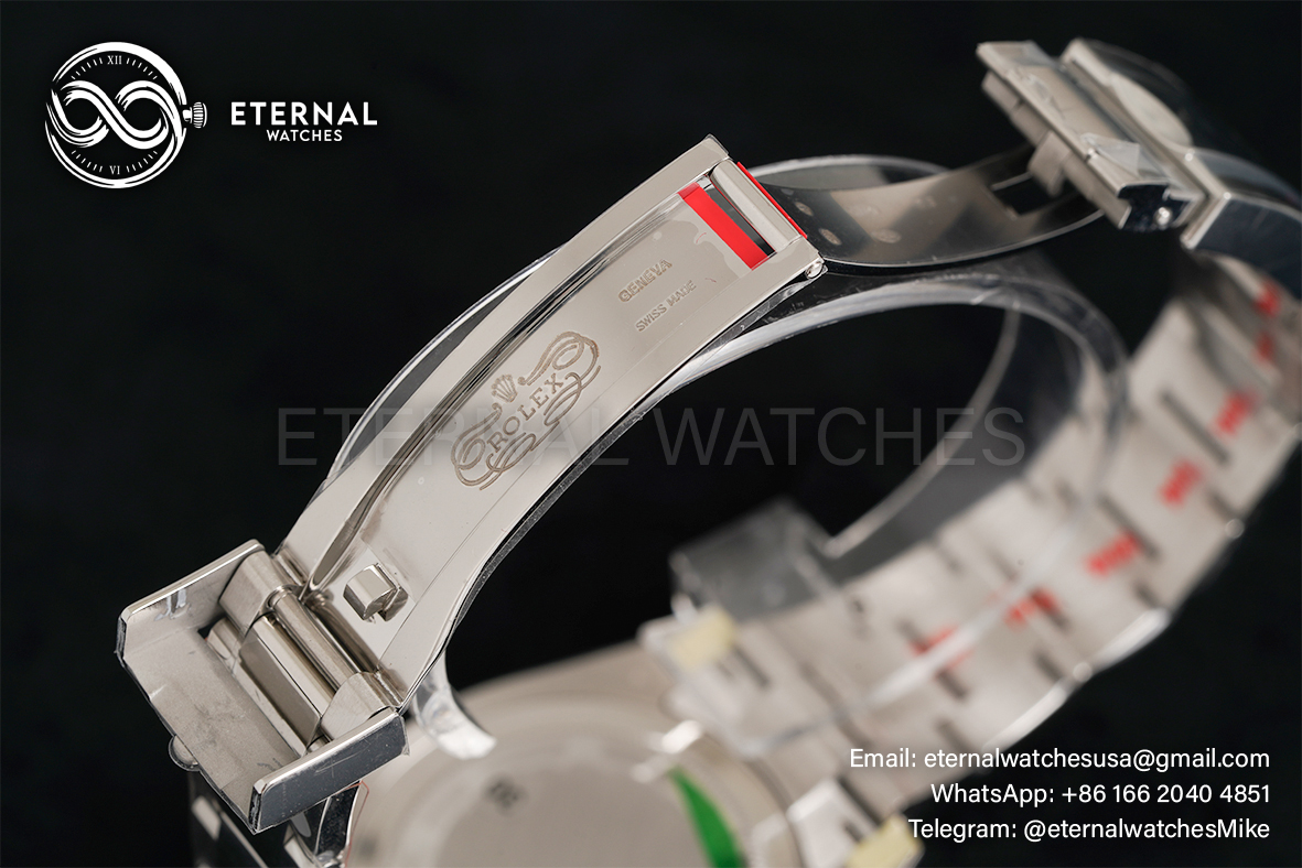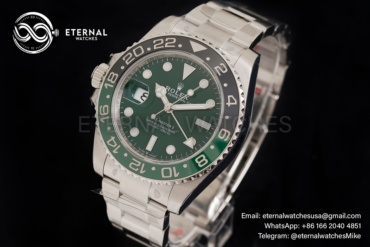 MOVEMENT:Asian Super Clone DD3285 Automatic GMT Movement, Correct Hand Stack CASE DIAMETER:40mm THICKNESS:12mm DIAL COLOR:Green Dial with Round Markers (Correct Hand Stack) - Superlume Applied CASE MATERIAL:Solid 904L Stainless Steel (Rehaut at 6:00 has random serial like Genuine) BRACELET:Solid 904L Stainless Steel Oyster Bracelet with Updated Rolesor Clasp FRONT GLASS:Sapphire Crystal with etched crown at 6:00 position (With light AR on Cyclops like Genuine) CASE BACK:Solid case back BEZEL:Black/Green Ceramic Bezel CLASP TYPE:Rolesor Clasp DATE INDICATOR:At 3:00 (Adjusted via crown)