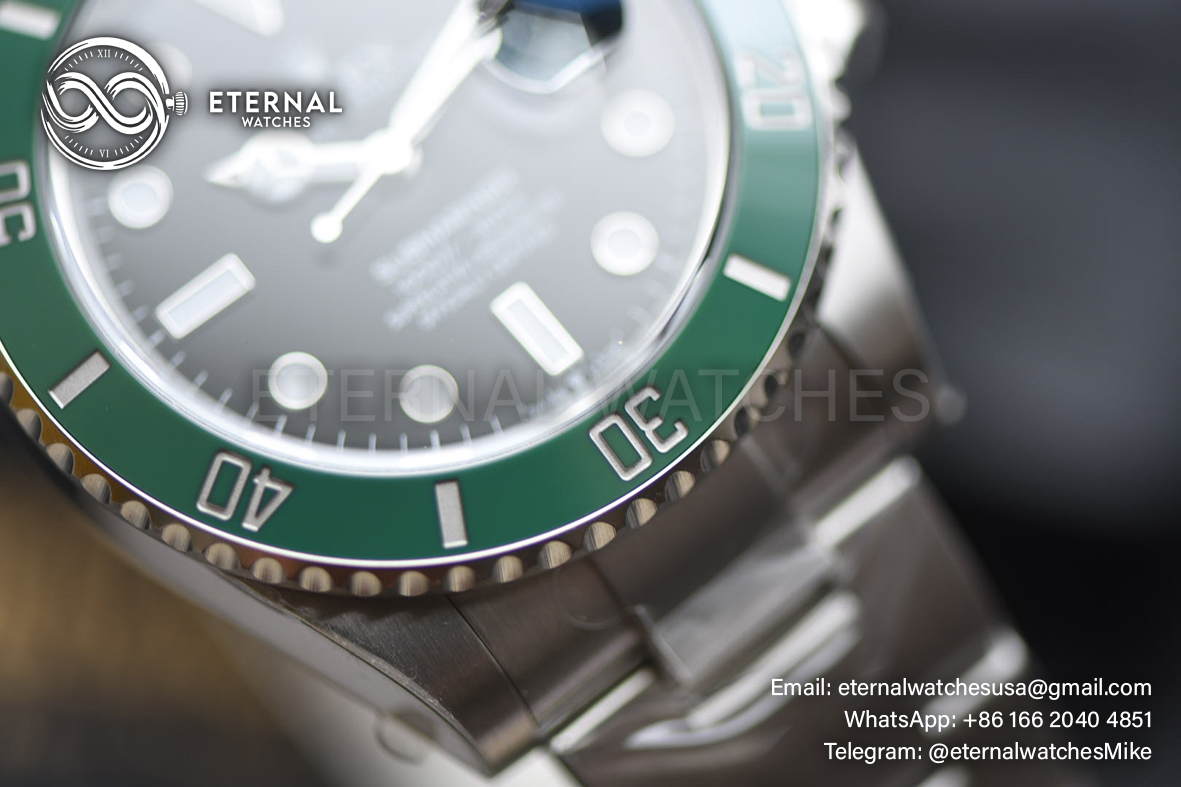 MOVEMENT:Asia Clone New Custom VS3235 Automatic Movement, 28800bph with Fully Decorated Rotor and Bridges & Plates like Genuine Rolex Calibre 3235 (Best Made Clone Movement from VSF) Case Diameter:41 mm Thickness:12.5 mm CASE MATERIAL:Solid Stainless Steel 904L (Same Top Quality as Genuine) FRONT GLASS:Sapphire Crystal (Same thickness as Genuine) - Etched crown at 6:00 position DIALCOLOR:Black Dial with Dot Markers (With Blue Superlume Applied) BEZEL:Green Uni-directional Diver Ceramic Bezel, Anti-Clockwise (With Superlume on Bezel Dot) BRACELET:Solid Stainless Steel 904L with Flip Lock Deployant Buckle CASE BACK:Solid case back CLASP TYPE:Deployant Buckle DATE INDICATOR:At 3:00 position (Adjusted via the crown) - Correct Date Mag of 2.5X