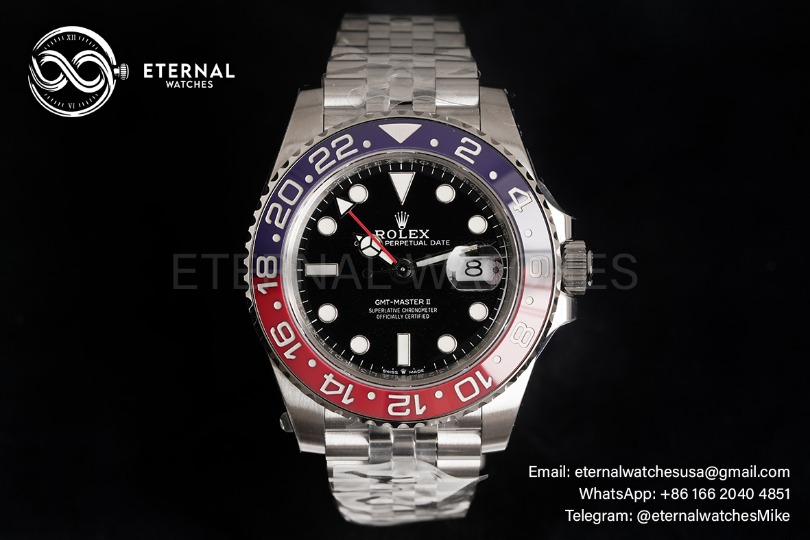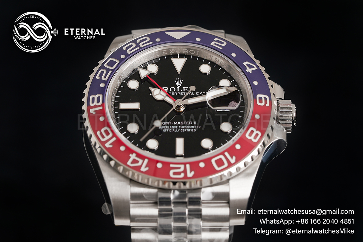 MOVEMENT:Asia Super Clone DanDong3285 Automatic GMT Movement with Decorated Bridges & Rotor with Correct Hand Stack (Hour Hand Adjustable),70+ Hour Power Reserve CASE DIAMETER:40mm THICKNESS:12mm DIAL COLOR:Black Dial with Round Markers (Correct Hand Stack) - Superlume Applied CASE MATERIAL:Solid 904L Stainless Steel (Rehaut at 6:00 has random serial like Genuine) BRACELET:Solid 904L Stainless Steel Jubilee Bracelet with Updated Rolesor Clasp FRONT GLASS:Scratch-proof Sapphire Crystal with etched crown at 6:00 position (With light AR on Cyclops like Genuine) CASE BACK:Solid Case Back BEZEL:Blue/Red Ceramic Bezel with Platinum Coated Numerals CLASP TYPE:Rolesor Clasp DATE INDICATOR:At 3:00 (Adjusted via crown)